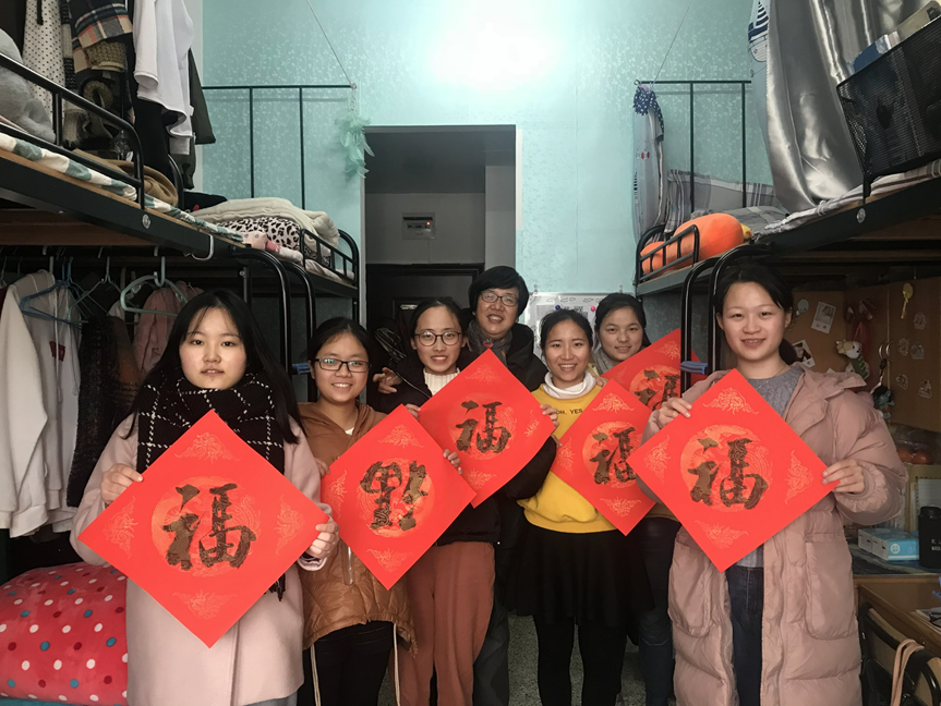 崔戴飞来到尚雅楼3105寝室和胜蓝楼5405寝室,为同学们带去学校书法老师亲笔书写的对联和“福”字,并祝同学们新年快乐。与同学们亲切交谈之际,崔戴飞询问同学们期末复习情况,同学们反映近期图书馆学习的人较多,座位较紧张。崔戴飞马上联系图书馆馆长,希望图书馆给同学们多准备些桌子,尽可能地满足同学们的需求。崔戴飞表示,学校会尽力满足同学们的需要,为同学们提供方便,但同时也希望同学们再接再厉,发扬刻苦学习的精神,争取期末考出理想的成绩。
