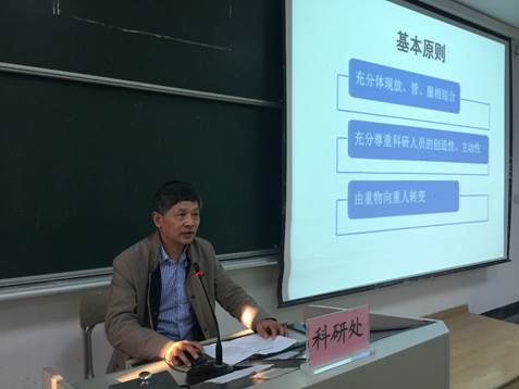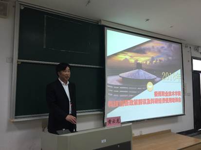科研处饶和平处长详细介绍了我校出台的各项科技创新政策的依据及新变化,强调了科研经费责任制,对如何科学编制项目经费、合法规范使用科研经费、加强横向技术服务、推进科技成果转化等,做了详细的介绍和讲解。计财处刘准能就科研经费报销规范方面做了介绍。衢州科技大市场的杨振球副总经理介绍了浙江科技大市场,提供了技术成果转化与交易方面的信息。