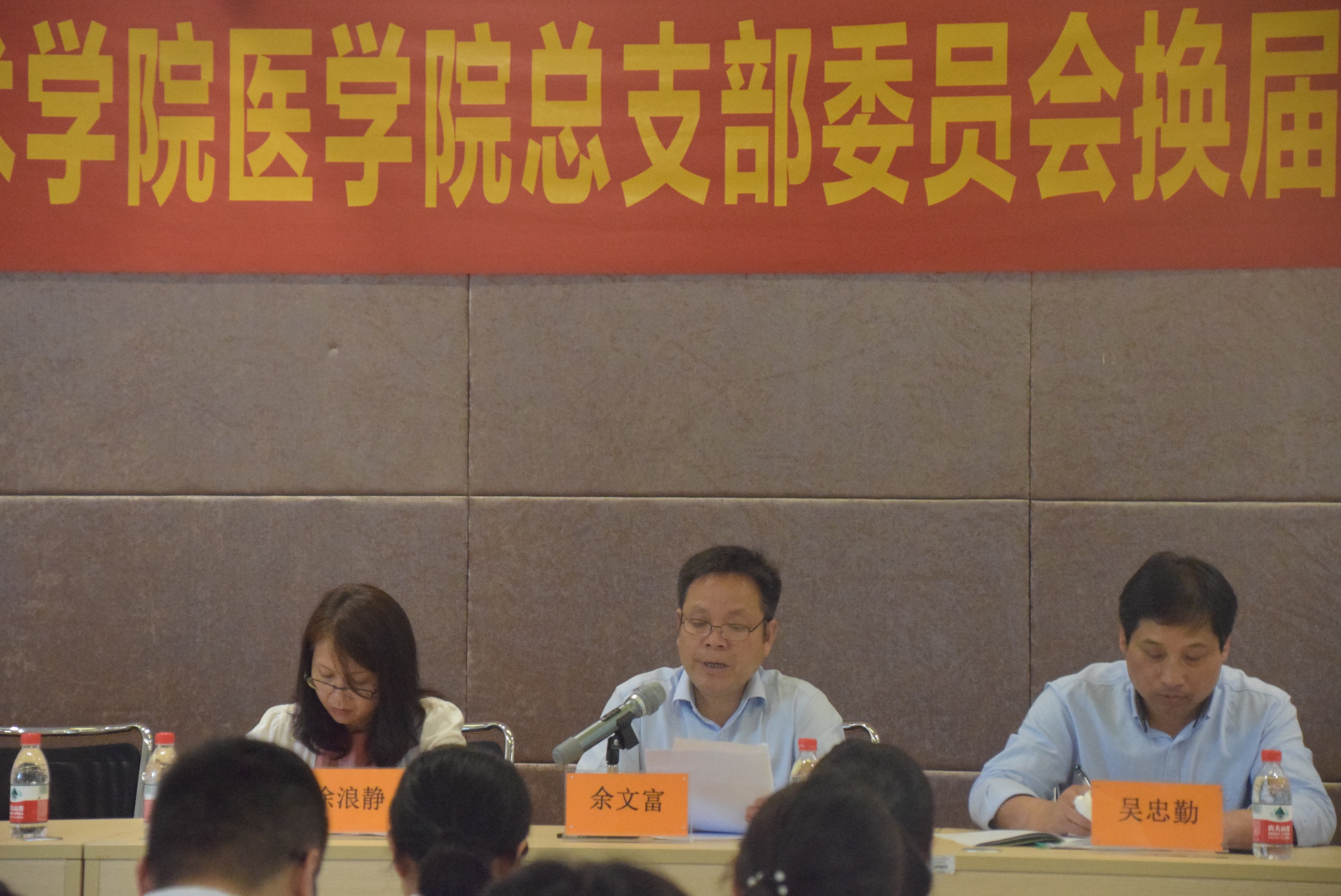 余文富首先对上一届总支委员的工作进行了回顾总结。他讲到,医学院党总支近年来在学校党委的正确领导下,全面贯彻落实高职教育办学理念和工作思路,以“大抓党建、抓大党建”为鲜明导向,凸显主体责任、实行“一岗双责,党政同责”,牢记职责使命担当、深耕管党治党责任田,层层压实全面从严治党责任,以高度的思想自觉、行动自觉抓好每一年的党建工作,坚定不移推动全面从严治党向纵深发展。