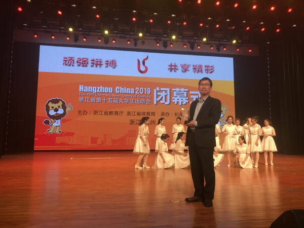 11月10日,浙江省第十五届大学生运动会在杭州师范大学圆满收官,本次大运会我校共参加了排球、羽毛球、健美操、武术、游泳、田径六个竞赛项目和一个阳光项目,共获得奖牌20枚,其中金牌14枚,银牌5枚,铜牌 3枚。同时,以团体总分第三名的优异成绩评为“校长杯”获奖单位。校党委副书记、校长江爱民出席闭幕式,并上台领奖。
