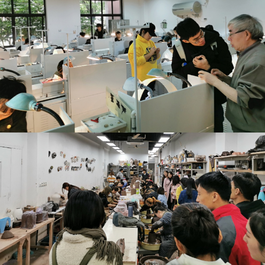 在专题学习之外,全体教师还参观了上海工艺美术职业学院的实训教室、大师工作室,对产教融合的实践教学模式进行了观摩学习。