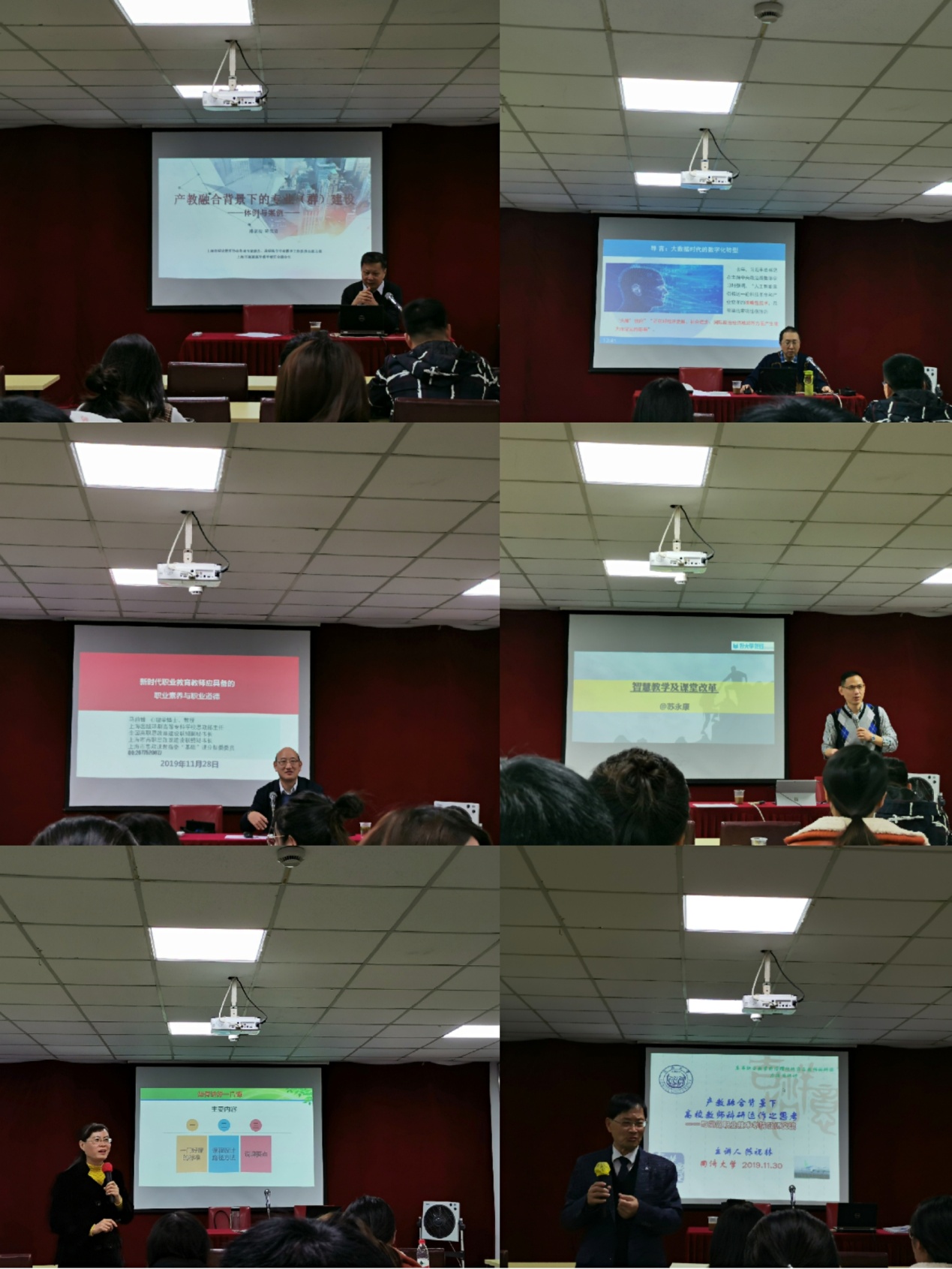 潘家俊研究员从产教融合背景下职业教育的目标与要求变化出发,对专业课程建设、学生多元化培养、新型教程选用、课程设计与教学计划制定等内容进行了分享;董奇研究员介绍了多元智力理论,并对现代职业教育教学理念、方法的运用进行了解读;马前锋教授从新时代教育环境变化对教师的职业素质挑战开始,分享了如何从知识、能力、素质、精神等各方面入手做好一名教师;苏永康教授对传统教学和智慧教学的教学形态进行了对比,对信息技术与教育教学深入融合、微课与慕课的设计与制作、混合式教学等内容进行了分享;薛元昕教授以“如何讲好一门课”为主题,对教学设计、教案写作和说课的要点进行了展示;陈祝林教授对职业学院教师的科研选题、设计、申报要点和科研论文的主要研究方法等进行了介绍。
