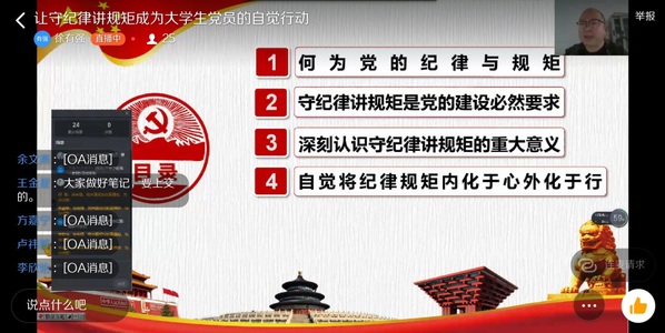 艺术设计学院教工党员徐有强、朱可成、霍庆福、何敬、王金星分别以《让守纪律讲规矩成为大学生党员的自觉活动》、《学党史知党情做一名合格的大学生党员》、《疫情就是命令防控就是责任》、《新冠病毒防控战役党员先进案例学习》、《入党流程实操培训》为题与2020年春季入党积极分子进行专题讲座交流。