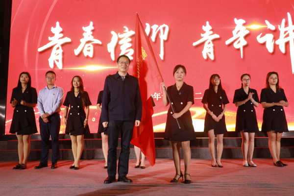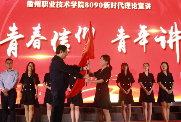 我校8090新时代理论宣讲团成员亮相并做自我介绍,党委书记徐须实向宣讲团成员代表陶莉莉老师授旗。