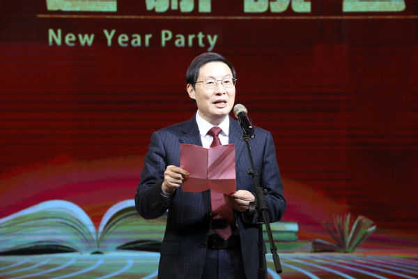 徐须实致新年贺词。他代表学校党政班子向一年来认真履责、辛勤工作的全体教职员工表示亲切的慰问。他回顾我校过去一年在社会培训、高水平专业群建设、校企合作、科技成果转化等方面取得的显著成就。