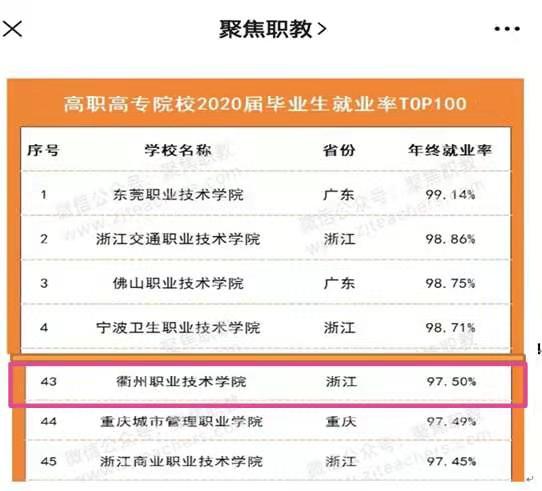 近日,“聚焦职教”发布“高职高专院校2020届毕业生就业率TOP100榜单”,我校2020届毕业生就业率在全国排名第43位,浙江省排名第13位。同时,毕业生在月均收入进入了全国高职高专院校百强。