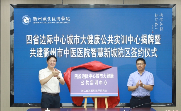 校党委书记徐须实与市发改委副主任郑建林共同为浙江省产教融合工程项目--四省边际中心城市大健康公共实训中心揭牌。
