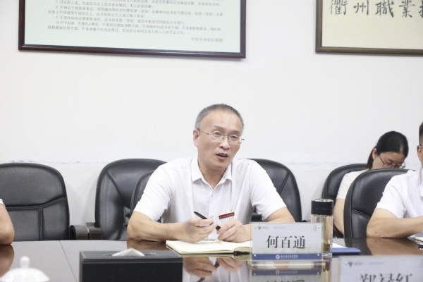 何百通表示对宁波职业技术学院一行同仁的到访表示热烈欢迎,并围绕创双高、强服务、育人才三方面介绍了学校近期取得的办学成果。他表示,两所高职院校都有医药卫生类的专业,办学各具特色,在国家大力推进职业教育的新阶段,可以充分利用政策优势、地方优势、学科优势等,深挖合作项目,拓宽合作领域,互学共赢。