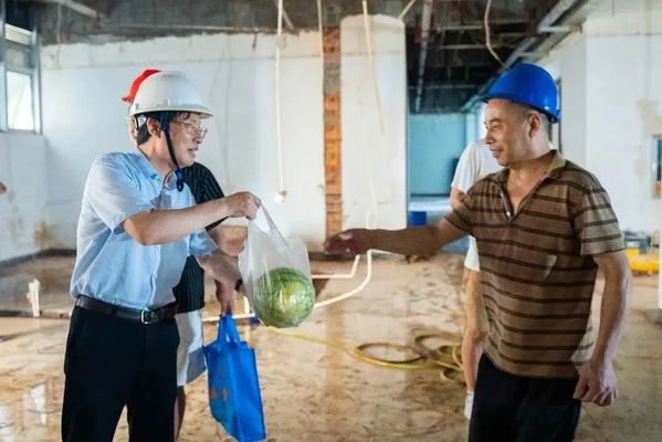 校党委书记徐须实现场检查督导项目改造工作,慰问施工人员,相关部门坚守岗位,全力保障各项施工顺利进行,施工方争分夺秒,战高温,斗酷暑,力争在确保质量的前提下尽早完工,给衢职师生一个美丽、温馨、安全的校园。