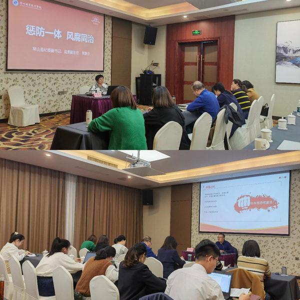培训邀请了常山县纪委副书记、监委副主任熊慧芬,常山县纪委、监委驻县教育局纪检监察组组长许建锋授课。熊慧芬以“惩防一体 风腐同治”为主题,通过政策文件解读、经典案例分析,深入浅出地讲解了风腐一体的重要特征,风腐同查、同治的工作运行机制,整堂课内容详实,具有很强的专业性和指导性。许剑锋作了“以严为本 当好纪律规矩‘守门人’”主题报告,深刻剖析了教育系统违纪违法案件的特点、原因和驻教育局纪检组的治理对策,既有理论高度,又有实践指导,对参训学员提高工作能力、强化履职担当有很强的指导意义和工作启发。