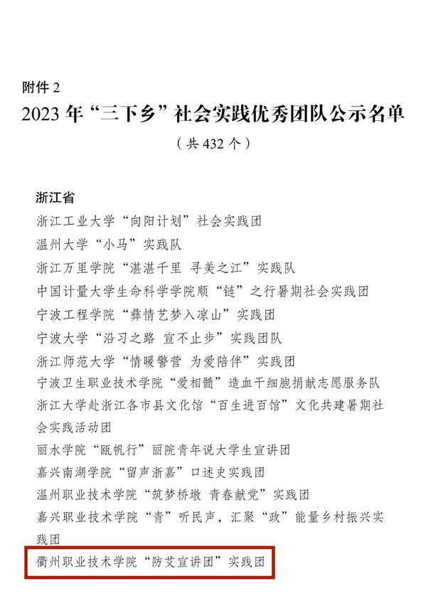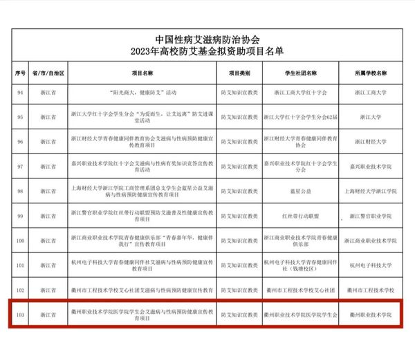 我校“防艾宣讲团”实践团成立于2023年3月13日,依托医学院高水平专业群,联合衢州市疾控中心,在校、院两级团委的指导下,开展了一系列线上线下形式多样的防艾宣传活动和暑期社会实践,并由日韩欧美福利视频_黑人巨大人精品欧美三区_欧美成人另类人妖_欧美在线精品一区二区三区_欧美一区二区三区性视频_日韩精品欧美视频_性欧美极品xxxx欧美一区二区防艾宣讲团的“艾滋病项目”申报,成功入围中国性病艾滋病防治协会2023高校防艾基金拟资助项目名单。