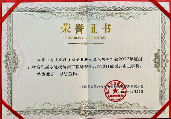 11月24日至25日,由省高等教育学会组织召开浙江省高职高专院校访问工程师校企合作项目培训会在杭州召开。经过现场汇报、交流、答辩等环节,我校张华老师主持的《高速公路功能人研制》访问工程师校企合作项目,荣获“浙江省高职高专院校访问工程师校企合作项目成果”三等奖。
