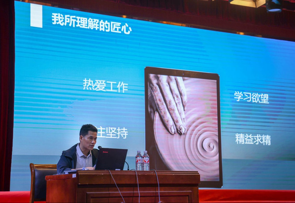 王定飞从“个人成长经历”“匠心永恒”“争创世界一流”三个方面,以自身事迹和精神激励学生。在工作中,他严谨钻研、一丝不苟并保持终身学习,热爱自己所做的工作,做到“简单的事情重复做,重复的事情认真做”。如此的信念使他在平凡的岗位上做出了不平凡的事迹。王定飞对在座的同学们表示殷切期待,希望同学们坚守匠心,保持耐心、专注、坚持,行行都能出状元!在场同学们倍受鼓舞。