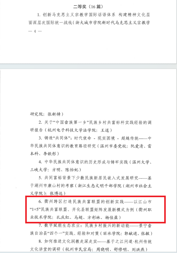 在浙江省民族宗教事务委员会2024年1月通报的2023年度全省民族宗教工作理论研究优秀成果中,我校的理论研究课题《衢州跨区打造民族共富联盟的创新实践——以江山市“1+5”民族共富联盟、开化县联盟矩阵发展新模式为例》荣获全省二等奖。