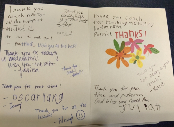 6月15日,是本次培训的最后一次课程,经过5个月的培训,先后有近300名自闭症青少年接受了“快乐羽球”培训,他们初步掌握了羽毛球基本技能,也体会到了体育运动带来的快乐。潘乐老师的教学得到了家长们的一致认可,也收获了学员们对他的爱戴。培训结束后,潘老师收到了来自协会和学员们送来的感谢信。