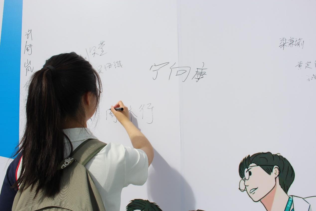 在报到签名墙前,新生们纷纷写下自己的姓名和对未来的美好祈愿,也是自觉成为医学院大学生的最初仪式感。