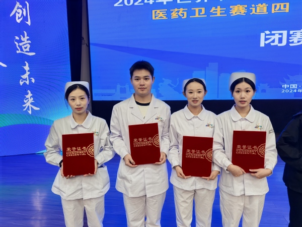 日前,2024年世界职业院校技能大赛总决赛高职组“医药卫生赛道四(护理技能小组)”争夺赛在岳阳职业技术学院开赛。来自全国各省、自治区、直辖市和新疆建设兵团的61支代表队展开激烈角逐,由医学院史路平、饶艳两位教师指导,钱娉妍、徐锐宇、陈欣语、张晴4位同学组成的参赛队获得铜奖。