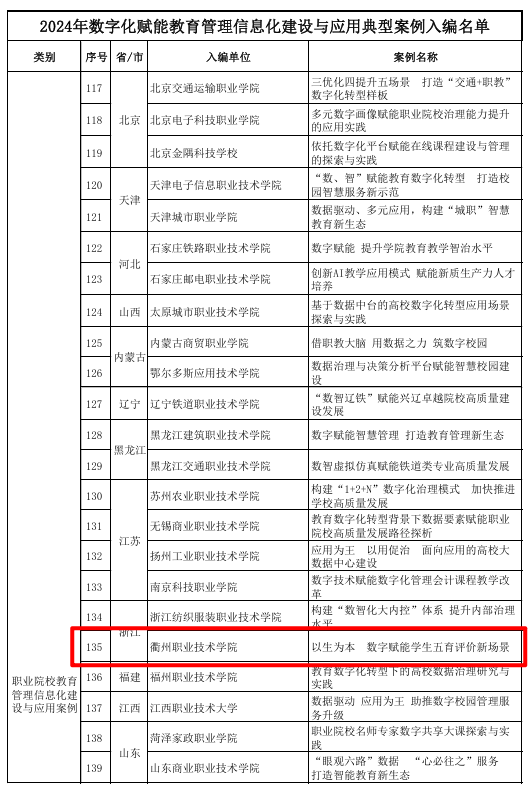 12月5日,教育部教育管理信息中心发布了《2024年数字化赋能教育管理信息化建设与应用典型案例》,我校《以生为本,数字赋能学生五育评价新场景》案例成功入选。全国入选职业院校教育管理信息化建设与应用案例共40项,其中浙江省职业院校仅2项。