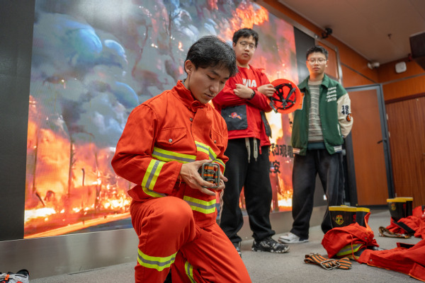 随后,班委在老师指导下进行消防服穿戴示范。厚重的消防胶鞋、消防服,搭配面罩与救援头盔,穿戴完整装备后行动极为不便,使学生们深切体会到消防员出任务的艰辛与不易,对消防工作者的敬佩之情也油然而生。