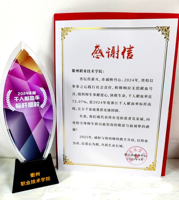 我校荣获2024年度"浙江省千人献血率标杆高校”荣誉