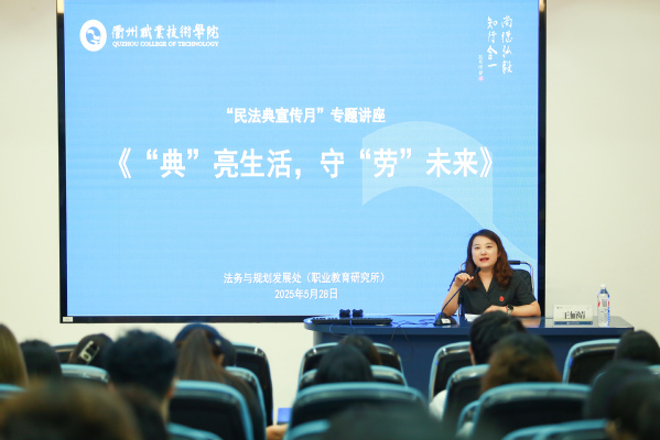 为提升学生法律素养,持续推进“民法典与生活同行”普法宣传工作,法务与规划发展处于5月28日在图书馆2号报告厅举办《“典”亮生活,守“劳”未来》“民法典宣传月”专题讲座。本次讲座邀请了柯城区人民法院民事审判庭二庭庭长、我校兼职法治辅导员王俪婧担任主讲,来自各二级学院的学生代表参加讲座。