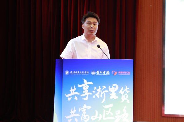 钟政致辞。钟政表示,此次“共享浙里货 共富山区路”活动,以“校企联动”为核心,与“钱江源品牌”的发展理念和实践路径高度契合。活动平台的搭建,将为开化县提供更广阔的销售渠道,让更多人了解和喜爱钱江源品牌农产品;AI公益的融入,也将为品牌推广和产品销售带来新的机遇和可能。期待与两校师生们携手合作,借助同学们的创新思维和专业技能,为乡村振兴注入新的活力。同时,期待与阿里巴巴公益共同探索“共谋、共建、共富”的县域合作新模式,让更多山区特色产品走出浙江,走向全国,为乡村全面振兴贡献更大的力量。
