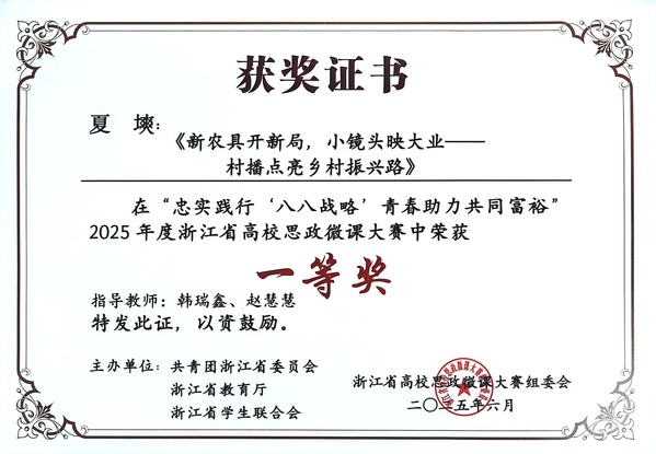 近日,由共青团浙江省委、浙江省教育厅、浙江省学生联合会主办的2025年度浙江省高校思政微课大赛决赛圆满落幕。我校师生斩获一等奖2项,三等奖3项。校团委马超老师微课作品《从移居到宜居 “千万”绘就新画卷》与经济管理学院学生夏塽微课作品《新农具开新局 小镜头映大业——村播点亮乡村振兴路》(指导老师:韩瑞鑫、赵慧慧)分别荣获教师组和学生组一等奖,继续保持了我校在全省思政微课大赛中的良好成绩。